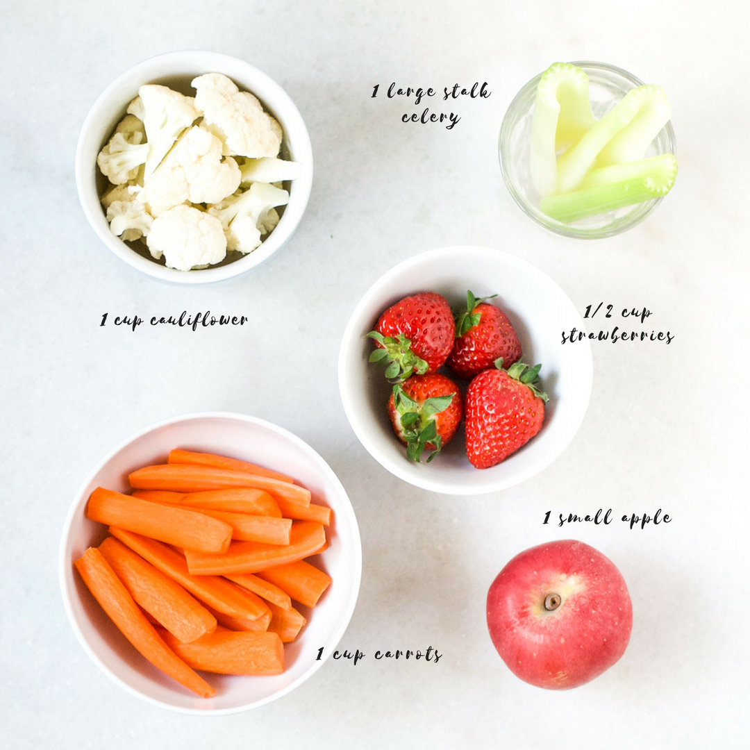 So what are your daily fruit and vegetable requirements? And what does that actually look like? Most of us need between 1.5 – 2 cups of fruit and 2-3 cups of vegetables every day. The precise amount depends on gender and age. You can find out exactly how much you should be eating here. The following pictures show what 2.5 cups of vegetables and 1.5 cups of fruit looks like. That is what an adolescent or a woman over 30 years should be eating every day. Younger women and men need a little more, but you get the idea.